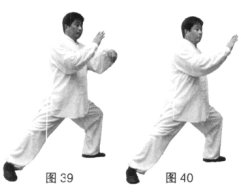(2)上动不停,松腰落胯两手向上向里划弧合于身体中线处,左手在外右手在里。同时左手变勾手勾尖朝外向下向后放于后腰处,右手成侧立掌向前推出。(图39、40)