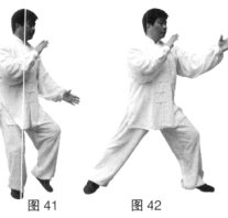 (2)上动不停,左胯松沉,左脚向左开步成左弓步;同时左手上提掌心斜向下,右手随势而动。(图42)