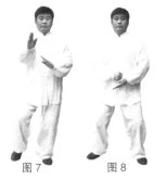 (4)上动不停,右脚向前上步成左实右虚步,同时左手随势向前向上再向下划弧至小腹前掌心朝上,右手随势向前向上再向下划弧放于左手掌心处(右掌下落时变拳放于左手掌心处);右脚踏实,重心下沉,两腿微屈。(图7、8)