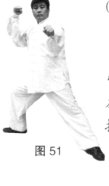 右胯松沉,重心移至右腿成右弓步;同时右拳向前向上向右划弧,左拳向里划弧再向前打出,两手成拉弓势。(图51)