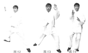 (4)随之中心上提,左脚尖内扣向后、向上勾挂乙右脚,左手向左引化,右手向前按击、(图51)