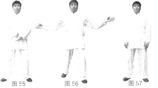 (2)右脚向右后撤步,左脚跟步;同时右拳变掌两手向外分开,向上,向内合于体前,再向下落于胯窝外侧,还原成太极站桩势。(图56、57)