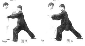 (1)左脚向左前方450上步成左弓步;同时两手左手在前、右手在后迅速上拥。(图4)