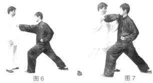 (要领:进步要贴身下沉,发力要松肩猛进。)