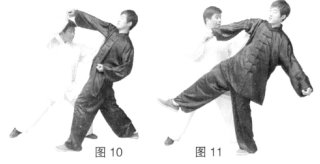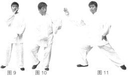 (4)如果甲接拳后以前手臂和后手合力将乙击出,就形成了挤击。(图9、10、11)(要领:甲后手缠拿乙手腕向后化带时,务必使对方前臂伸直以化解其力。)