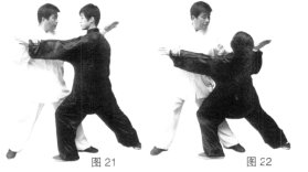 (3)甲沉腰松胯侧身上步化解乙拳,使其力落空,左手置于乙颈部后侧,右手缠拿乙左手腕。(图21)