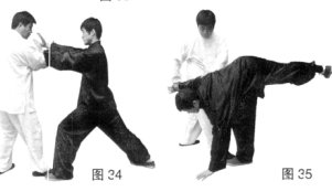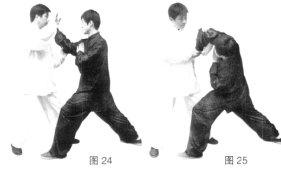 (3)甲侧身上步化解乙掌,同时两手由内而外划弧上拥接掌,前手上搬乙肘,后手向下採握乙腕。(图24、图25)