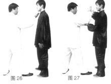 (3)甲身体下沉上左步,左手经胸前划弧上拥乙手臂、(图46)