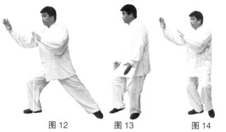 (1)右胯松沉,身体微右转,左脚脚尖内扣,右脚撤步成左实右虚步;同时左手上抬,两手匀速后收划弧放于身体两侧。(图12、13)