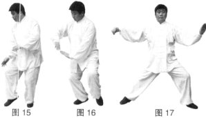 (1)重心移至左腿成左实右虚步,身体微右转;同时两手划弧下沉,身体保持中正。(图15)