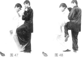 (4)乙再提左膝攻甲腹部,甲左转撤右步,右手走下弧向左推掌化解(图47、48)