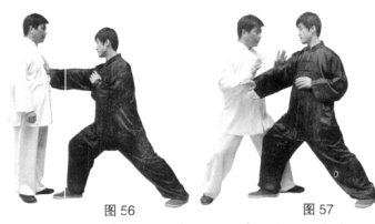 (3)甲侧身下沉,双臂下压捋带乙手臂,使其劲落空,同时进步双拳击打乙胸。(图57、58)