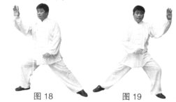 (2)上动不停,左胯松沉,重心移至左腿成左弓步;同时右手向下向左顺时针划弧至小腹前,左手顺势向上向左划弧至身体左侧。(图19)