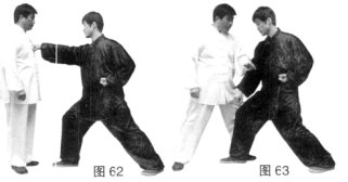 (3)甲沉腰松胯右脚后撤,成左弓步,左臂由外向内向下划弧拦压乙右臂。(图63)