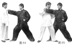 (3)甲左脚上步至乙右腿内侧身,两手划弧上拥捋接乙右臂。(图65)