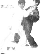 (4)甲沉腰松胯顺势向前上步贴近乙身,同时手顺着乙方劲路向下穿出,用肩靠击乙方胸部。(图75)