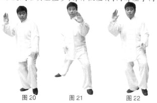 (1)右胯松沉,左脚经右脚向左前上步成左弓步;同时,左手由上向下向右划弧,再向左前下按,右手向右向下划弧自然下落于右胯处。(图20、21)