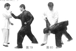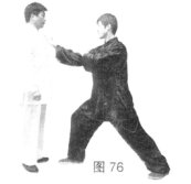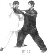 (3)甲松胯屈膝侧身上步至乙腿后方,两手划弧上拥捋接乙手臂,乙顺捋劲进身肩靠甲胸部。(图77)