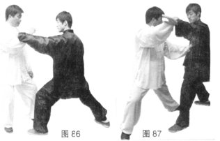 (3)甲沉腰转胯右臂划弧上拥外化乙左臂,侧身进步,顺势左拳击打乙胸部。(图86、87)