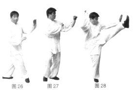 (2)上动不停,松腰落胯,重心移至左脚,右脚虚步上踢;同时两拳继续向下向左划弧,两拳变掌,左掌架于身体左上方,右掌向下拍击右脚脚面。(图25)