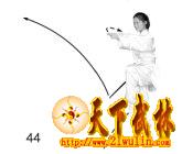 1、上体向左转。右腿直立支撑;左腿屈膝向前抬起,脚尖下垂。同时右手持剑腕部翘起,使剑尖锋向前至右膝外侧,左手剑指向前直臂平举,拇指侧向上。目视剑指(图44)。
