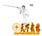 2、左脚向左前方落地,左腿直立,身体重心移于左腿;右腿伸直,右脚跟抬起。同时右手持剑向左前上方直臂刺出,高与眼眉平,手心向上;左臂屈肘,左手剑指收于胸前,手心向下。目视剑身(图45)。