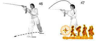 3、右、左脚依次向右前方弧形上步,右脚尖向外撇,左脚尖向内扣。同时右手持剑向左上运行;左手剑指置于右臂内侧,手心向下。目视剑身(图46、47)。