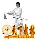 3、左脚向前上步,右脚向左脚并拢,两腿直立。两臂自然下落垂于身体两侧,右手心向里;左手反握剑柄手心向后,剑身贴靠左臂,剑身垂直于左侧。目视前方(图63)。