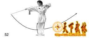 2、右脚向右后落地,右腿伸直;左腿屈膝。同时左手持剑外旋手腕翘起,使剑尖锋领先向上、向左、向下弧形穿出;左手剑指收至右肩前,手指向上。目视剑身(图54)。