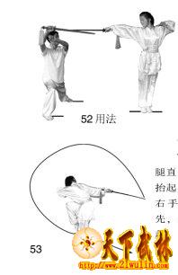 1、上体向右转。左腿直立支撑;右腿屈膝抬起,脚尖下垂。同时右手持剑使下剑刃领先,经右腿外侧向后撩起,剑尖锋高与腹部平;左手剑指收至胸前,手心向下。目视剑身(图53)。