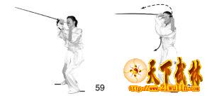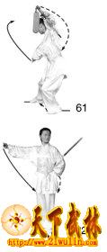 1、上体向右转。左手反握剑柄,使剑柄经上向前劈出,剑身贴紧小臂内侧,手心向下;右手成剑指向下、向右侧摆出,虎口向上。目视右手(图61)。
