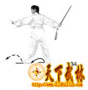 1、上体向左转,身体重心向左移。同时右手持剑向上、向左劈;左臂屈肘,左手剑指收至右小臂内侧,手指向上。目视剑身(图32)。