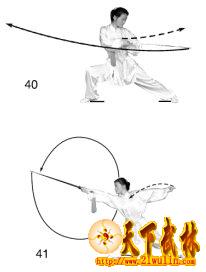 上体向右后转。右脚向右侧方迈步,右腿屈膝半蹲,左腿伸直,成为右弓步。同时右手持剑向外旋转,使上剑刃领先向右斜上方削出,右臂伸直手心向上,剑尖锋高与头顶平;左手剑指随之向左侧直臂平摆,手心向上。目视剑身(图40、41)。