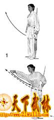 2?郾上体稍向左转。右手成剑指向右前直臂平举,手心向左;左手持剑屈肘上提至腰左侧,手心向后。目视右手(图2)。