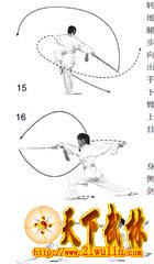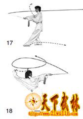 1?郾身体重心后移。左脚撤半步,两腿屈膝。同时右手持剑向外旋转,使剑在身体右侧向后、向上、向前绕环立圆。目视前方(图17)。