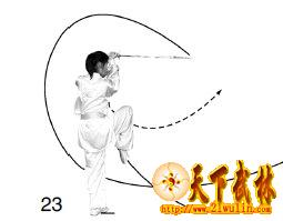 1?郾左腿直立支撑;右腿屈膝抬起,绷脚面。同时右臂屈肘,右手持剑向外旋转,使下剑刃领先向上托起,高与眼眉平,手心向里;左手剑指屈肘向右摆,至右前臂内侧,手指向上。目视剑身(图23)。