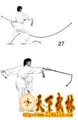 1?郾右脚向前上步。同时右手持剑向上、向左下摆出,手心向里;左手剑指屈肘置于右腕内侧,手心向下。目视剑身(图27)。