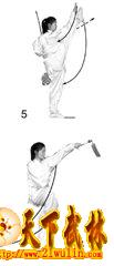 2?郾右脚向前直腿踢起,绷脚面。同时右手向上、向前迎击右脚面;左臂屈肘左手持剑收至左腰侧,手心向后。目视前方(图5)。