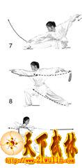左手剑指平举的动作可适当放慢速度,上体略向前倾。
