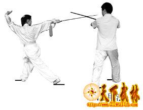 左脚蹬地向前跳步的动作求远不求高,剑摆压与左脚落地的动作同时完成,剑直刺时两手同时向两侧分开。