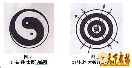 圆的运动形态,表明太极螺旋缠绕的旋臂松紧程度与涡旋速度成正比,慢松快紧,上限为