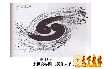 而太极的故乡—中国,更是以太极思维和太极图形将现代科学与艺术结合,创造了前无古人的太极绘画形象。1988年,诺贝尔奖获得者李政道博士在北京主持召开了世界“二维强关电子系统国际讨论会”,李政道博士邀请我国著名画家吴作人,专门专题为大会制作大会会标。吴作人根据会议研讨的尖端科学内容,调动自己对中国古老太极思想的理解,融和科学与艺术境界,绘制了“太极图”会标(见图13)。