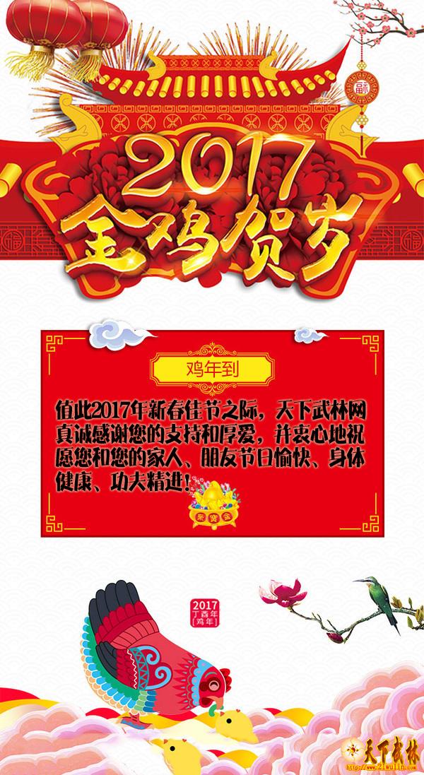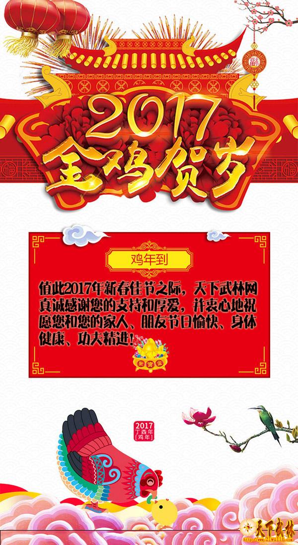 值此2017年新春佳节之际,天下武林网真诚感谢您的支持和厚爱,并衷心地祝愿您和您的家人、朋友节日愉快、身体健康、功夫精进!