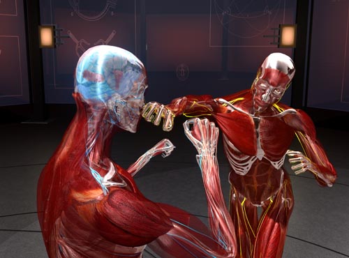被这样的力道击中头部会发生什么呢?答案是头颅内的脑部发生位移,引发连锁反应,颅骨的震荡很快就停止了,但漂浮在脑脊髓液中的脑部则持续移动。脑部撞上后脑杓导致后脑受伤,再猛然回弹,撞上前方的颅骨导致前脑受伤。神经传导物质大量释出,一场电子风暴导致神经短路,医师称之为严重脑震荡。科技证实了一拳击倒对手的武林传说是确实存在的。