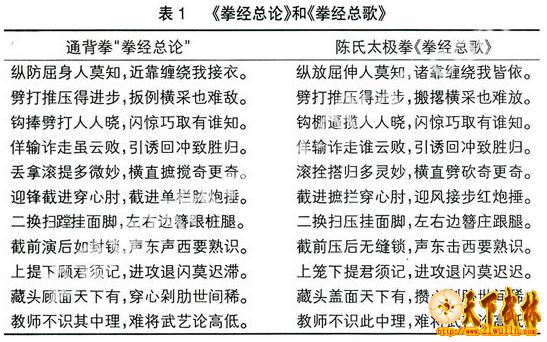 郭永福所传的《拳经总论》七言二十二句和河南陈家沟九世陈王廷所传《拳经总歌》七言二十二句,二者仅有个别字不同,现列举如表1。 以上二篇《总论》、《总歌》无疑是大体一致的,显然出自一人。陈王廷做为明清之际的“文武庠生”,博学多才,深谙武功,他大量吸收了明朝爱国战将戚继光的武学精粹,创编了长拳108势、炮捶等实用武功后世流传。为了得到证实,不妨再将陈王廷的《拳经总歌》和戚继光的《拳经捷要》进行对比,不难看出陈氏家传武功的源流与发展。 从以上武学对比来看,陈家沟九世陈王廷的确是文武皆备的全才,他继承和发展了戚继光的武学精华,创编了长拳108势等武学,也奠基了后世定型的陈式太极拳。因为明朝战将戚继光就对多家民间武功精华进行了整理,并用于了实战,而且根据临战经验总结出了大量的武学心得,如:“刚在他力前,柔乘他力后,彼忙我静待,知拍任君斗”(纪效新书卷第十二〈短兵长用篇〉);“千言万语,不外乎[致人而不致于人],”[后人发,先人至],“总要只是乘他[旧力略过,新力未发]八字耳,至妙至妙”。“俱是顺人之势,借人之力,即要快捷,又要似进实退,而后进则大胜矣”(纪效新书)。戚继光这些武学实战心得,被陈王廷大部接受,所以独创了拳、械套路。经后人的不断学习和理解,形成了中国特有的太极文化和原始风貌的通背拳108势武学系列。 历经数百年,洪洞通背拳仅是一个地域拳种名称,其实在山西广泛地区都有通背拳流传,如有灵石县、霍州市、洪洞县、临汾市、河津市、运城市、万荣县、永济市、临猗县等山西广大地区,目前,洪洞通背拳在国内、国际上得到了前所未有的广泛传播和发扬光大。洪洞通背拳和陈式太极拳是否一脉相连,有待更深入的研究和探讨。