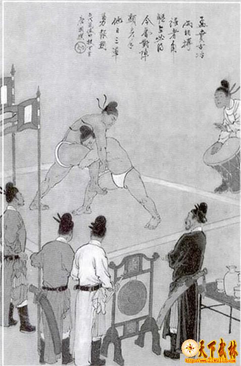 有一种类似近代摔跤的体育运动,在宋代时称为相扑,也叫作角抵、角力。传说相扑的起源很早,可以上溯至先秦。唐、宋之际,城市经济和商品交换有了长足的进步,民间文体活动也随之广泛地开展起来,其中相扑运动日益受到宋人的重视和喜爱。