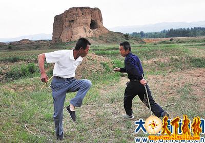 塞上清冽的晨风中,两位农夫打扮的人都手持一根长不到1米、形如鞭杆的细木棍,在田野间近身搏击。一人身材中等、目光凝重,一人个子略矮、面色黝黑,二人手中鞭杆上下翻飞,一个棍如毒蛇吐信,一个鞭似疾风扫叶,前俯后仰,腾挪闪让,变化莫测,看得人眼花缭乱。倏忽间,二人身形一分,抱定守势,凝神相对。在他们身后远处,沧桑的古长城,残破的明宣威楼遗址,和那罩在雾气中的群山成了绝佳的背景,这一切如同武侠小说中的场景,呈现在记者的眼前……