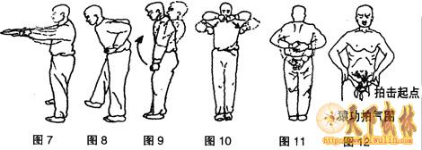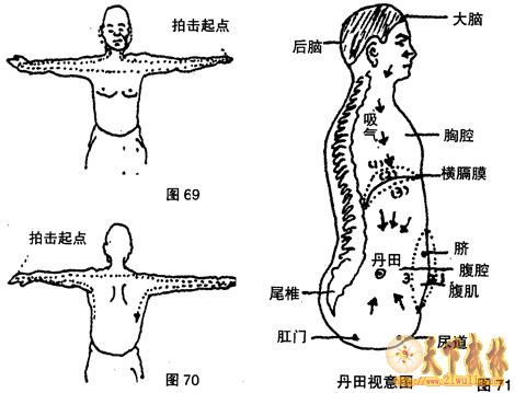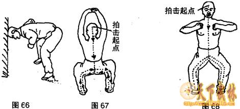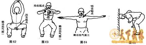 鹤功拍气法由第四至第八口气开始拍击,自尾闾拍起,沿背上行,至项部而止,所谓二十四气也。而第十至第十八口气则拍击胸部、即所谓口斗处。第十九至第二十四口气则拍击将台,即所谓血盆处。此次拍击不以次数为限,是以学者呼吸起止为度(图62—图64)。