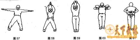 两膝伸直,身体直立,两手各向左右伸平,易拳为掌,手心向上,人如“大”字形,行呼吸一次,是为第十九口气(图56,图57)。