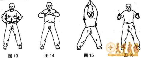 最后两脚收回,同时又行吸气,身体立正,两掌同时收至胸前,与两肘成平线,吸气毕(图9,图10)。两拳顺乳斜行而循肋部绕到背后,指尖向下(图11)。两手复分两旁而气亦呼尽,此为第十五口气。